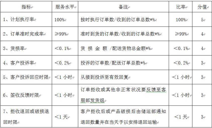 3.服務(wù)要求(1)遵循最安全,最合理的運輸方式和時限、提供最優(yōu)的價格。將貨物直接送達指定的收貨人。(2)對于當天15:00前的出庫貨物,必須當日取完,并在當日根據(jù)實際發(fā)貨情況安排寄送。需提供每天物流單號。(3)貨物出現(xiàn)損壞、丟失等情況需要出具正式的書面說明,并按貨物丟失造成損失進行賠付。(4)提供保質(zhì)保量和高效的服務(wù),包括節(jié)假日,配送投遞提供12小時服務(wù)。(5)責(zé)任感:業(yè)務(wù)員必須細心核對運輸貨物,如發(fā)現(xiàn)物件與實際貨物存在不符時,應(yīng)現(xiàn)場核對,減少錯誤率。(6)要求把貨物送到客戶手里后的運輸單據(jù)保存一年。(7)要求指派專人負責(zé)我方貨物運輸業(yè)務(wù)。(8)要求派人對我方打包好的貨件在我方現(xiàn)場進行分單,以及搬運作業(yè),我方現(xiàn)場監(jiān)督。如發(fā)現(xiàn)重量、箱號與事實不符,需重新作業(yè),并處以每單50元的罰金。(9)國內(nèi)配送時限(門到門):根據(jù)所運輸貨物到達省份以最快速度送達。在規(guī)定的時間內(nèi)務(wù)必送達,否則承擔(dān)客戶的投訴或賠償責(zé)任。(10)對于寄送的貨物客戶未簽收、包裝破損、重量不符的由中標方承擔(dān)一切責(zé)任和后果。